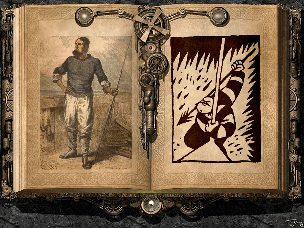 Once Aronnax and Conseil set out aboard the steamship Abraham Lincoln in search of the "monster", they are introduced to master harpooner and Canadian, Ned Land. I was amused as an adult to read Ned's heritage, since modern perceptions of Canadians are far from the robust, frontiersmen-like aspect Ned strikes. The casting of Ned Land in film versions of 20KL is an interesting commentary on the character and the development of the Canadian stereotype. In the middle of the nineteenth century, Canada was still a vast, untamed frontier - so to have a "manly-man" like Ned Land hail from the Great White North made sense. Kirk Douglas's performance as Ned in the Disney version is more happy-go-lucky than the Ned of Verne's 2KL, but he is a far cry from Canadian Peter Gross's pretty-boy in 1997, the same year Australian Bryan Brown played Ned in the McDreamy version. Brown's portrayal is truer to Verne's Land, but was undercut by the inclusion of an African-American character Cabe Attucks, which was sheer racial tokenism, as the character, intended to replace Conseil, actually ended up mirroring Ned Land as a second man-of-action in the storyline. To be cliche, there ain't room aboard this ship for two men like that. Ned Land acts as the physical foil to the mental prowess of Nemo, and adding another such character turns the tale into a cheap adventure story, which contrary to popular perception, it is not. I will add here that I love reading Ned Land as a French-Canadian, since lines like "Open up there, you antisocial navigators!" sound way funnier when you give them a stereotypical French-Canadian accent.